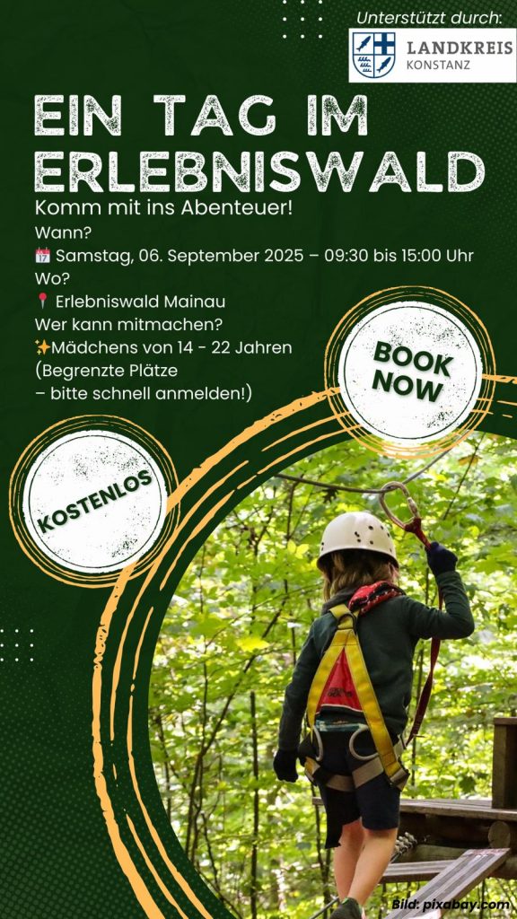 Am Samstag, den 06. September 2025, laden wir alle Mädchen im Alter von 14 bis 22 Jahren herzlich zu einem spannenden Ausflug in den Erlebniswald Mainau ein. Unter dem Motto „Komm mit ins Abenteuer!“ verbringen wir gemeinsam einen erlebnisreichen Tag in der Natur – mit Spaß, Bewegung und vielen Überraschungen!